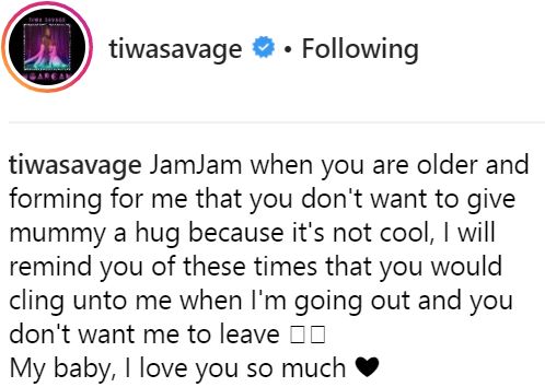 The songstress however has promised to remind her son Jam Jam of how he wouldn’t let her go out when he grows up, especially when he starts to think giving her a hug isn’t cool anymore.